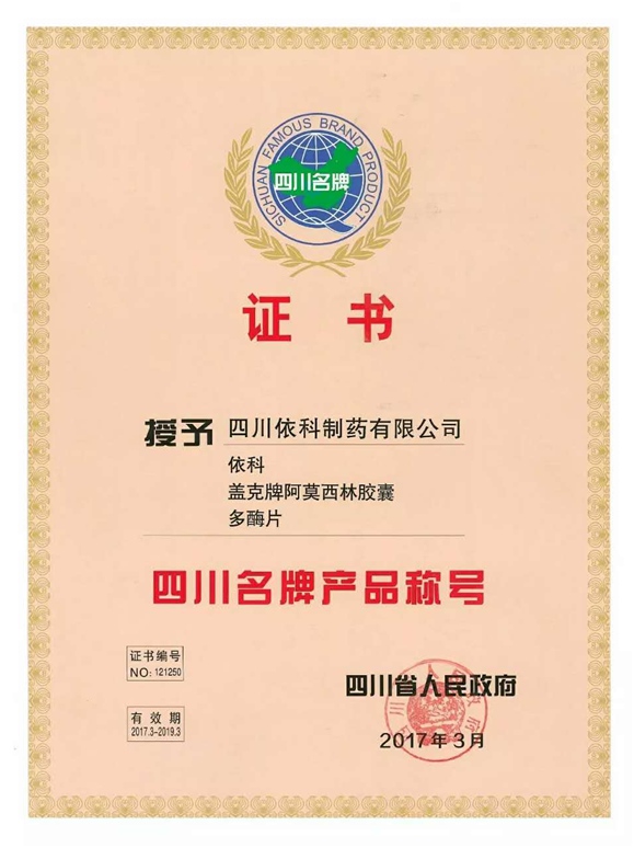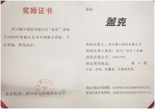 公司高度重视品牌战略,依法注册了“盖克”、“蜀中”、“三星堆”、“阿莫锋”、“益善源”、“蓉通”、“开云综合体育网站”等108件注册商标,1999年“盖克”、2003年“蜀中”、2007年“三星堆”被认定为德阳市知名商标,2001年“盖克”、2004年“蜀中”被认定为四川省著名商标, 2008年“盖克”商标被国家工商行政管理总局认定为“中国驰名商标”。2017年3月,公司盖克牌、开云综合体育网站牌阿莫西林胶囊和多酶片被四川省人民政府授予四川名牌产品称号。2016年,公司实现营业收入66373万元,利税7600万元;2017年,公司实现营业收入75045万元,利税7572万元。公司2017年被命名为德阳市第七批院士专家工作站,2016-2018连续三年被德阳市人民政府确定为重点龙头企业。